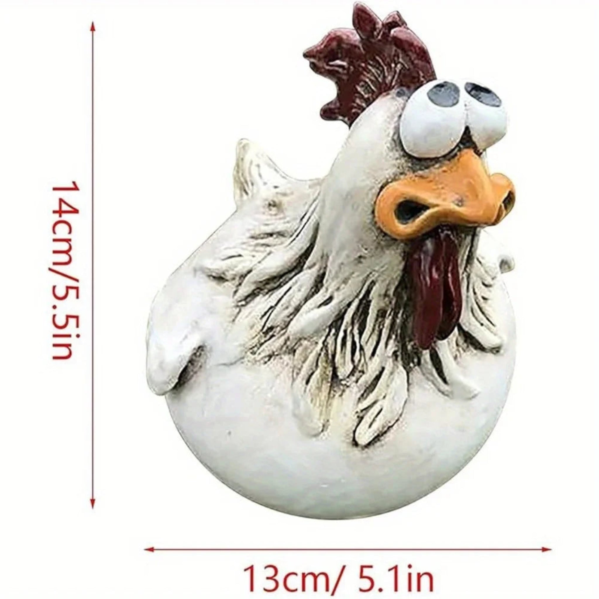 Description: One-piece resin chicken sculpture crafted for outdoor display on fences, gates, or posts. Durable, hand-painted with a playful “surprise” character, and designed to withstand the elements with a weather-resistant finish. Perfect for farms, gardens, or homesteads and makes a fun gift for chicken lovers.