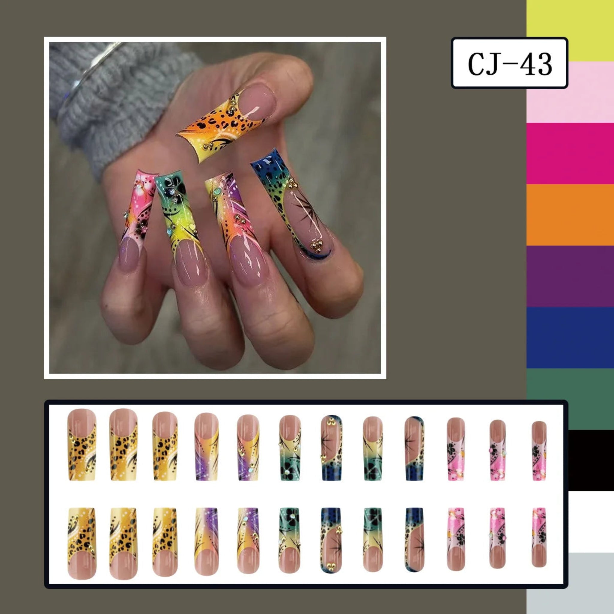 European Long Coffin Press On Nails Color Flower Leopard Print Fake Nail