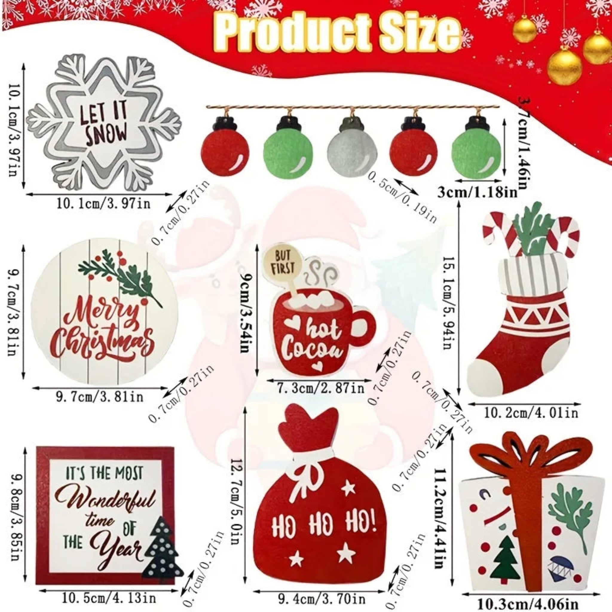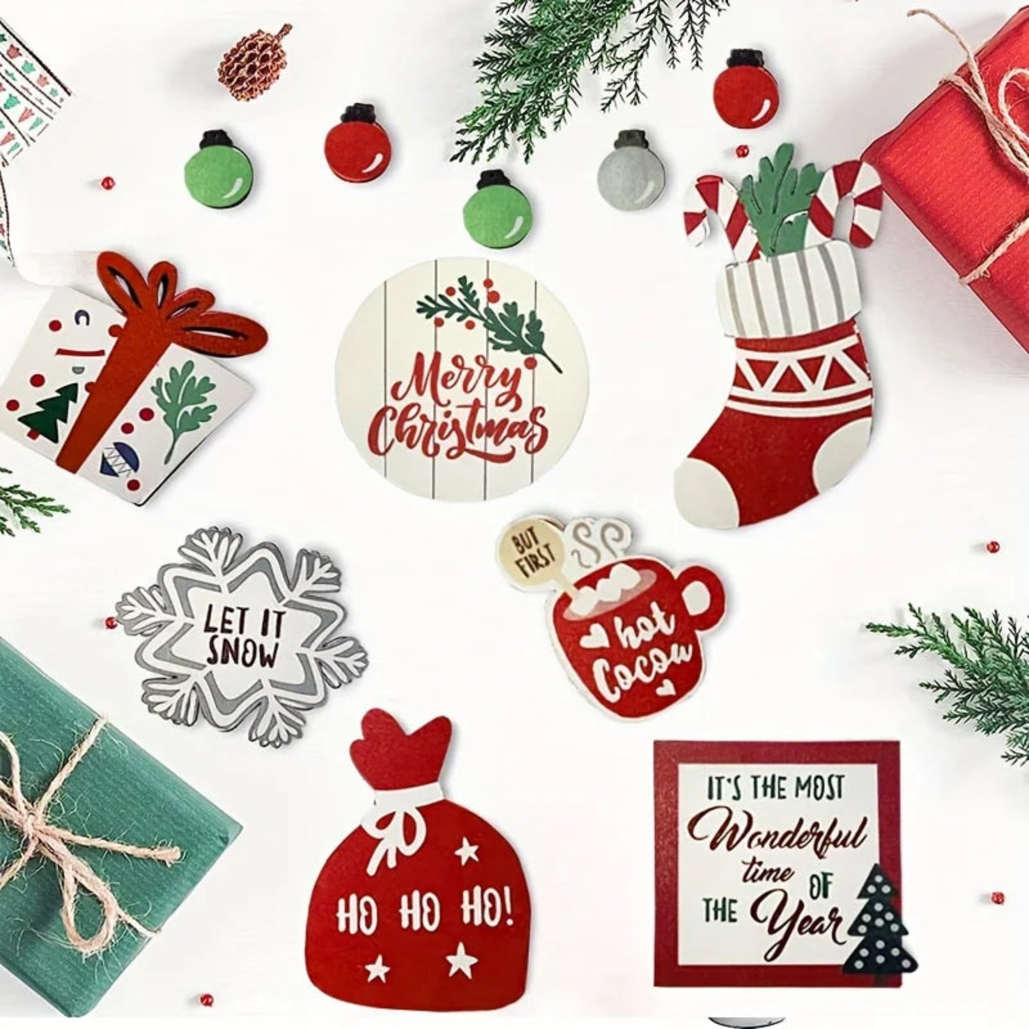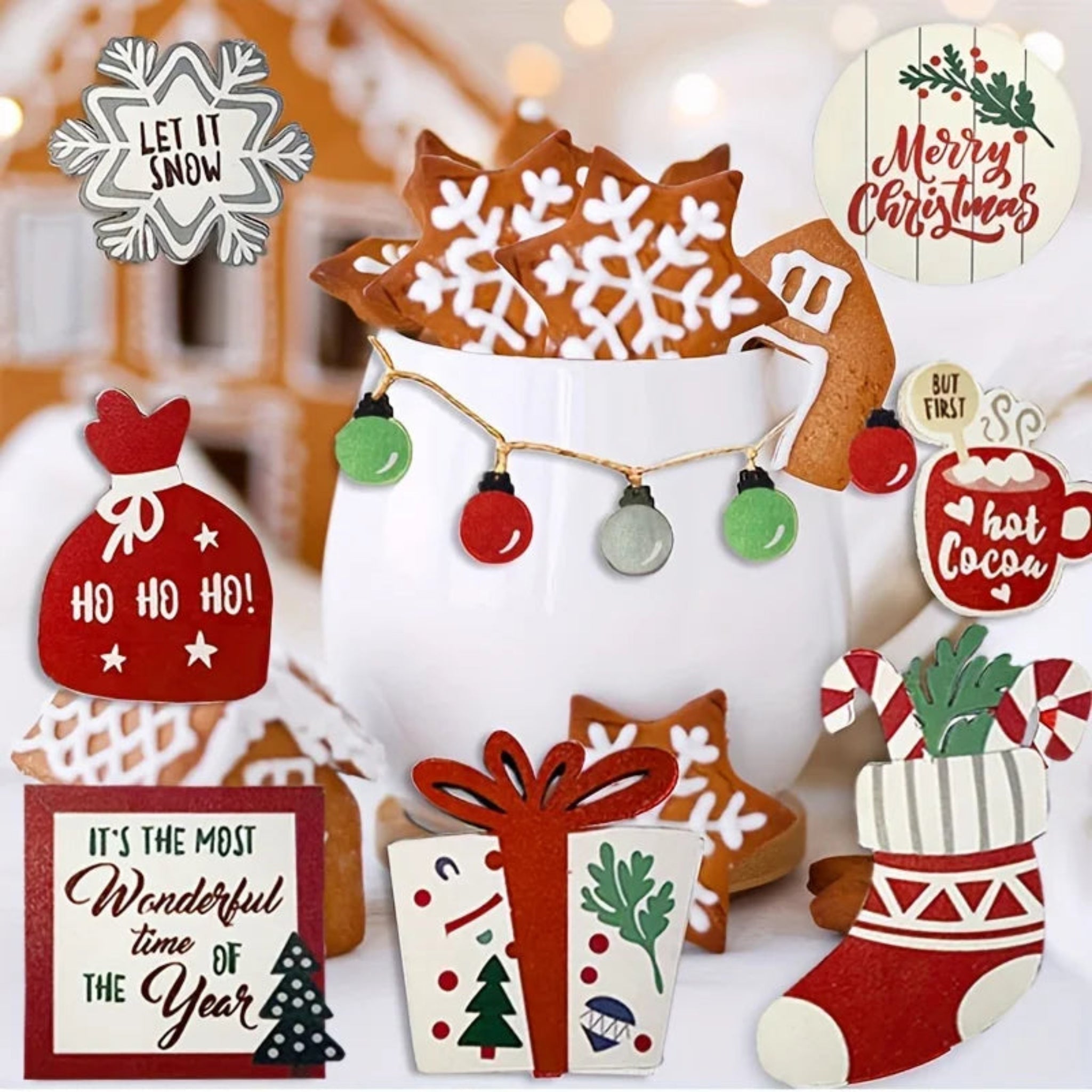 The set includes farmhouse-themed designs such as bells, coffee cups, snowflakes, and cookies, providing an expert touch to your holiday décor.