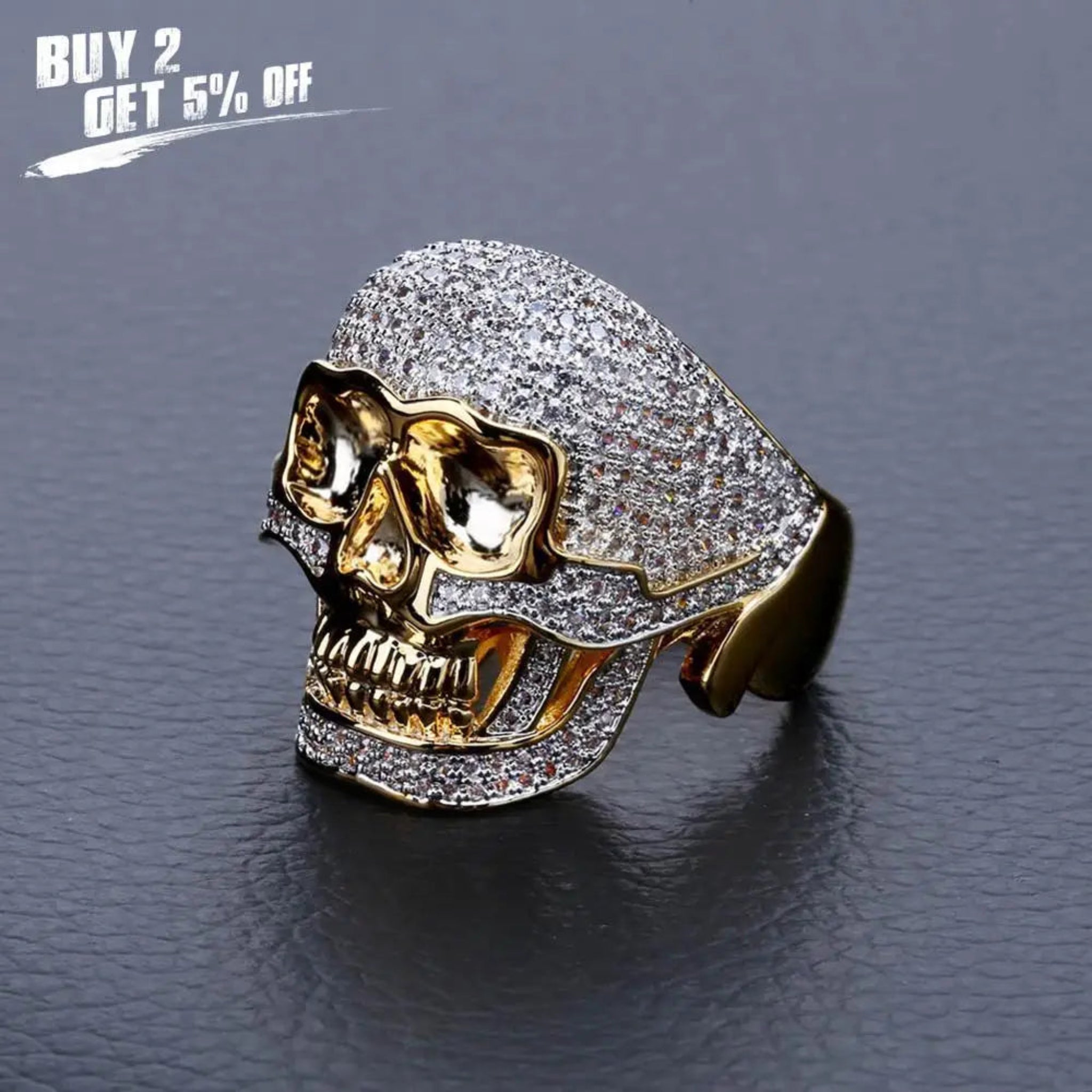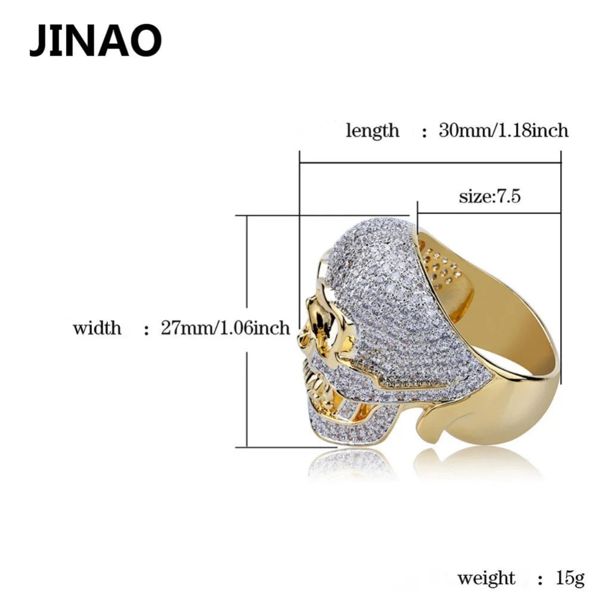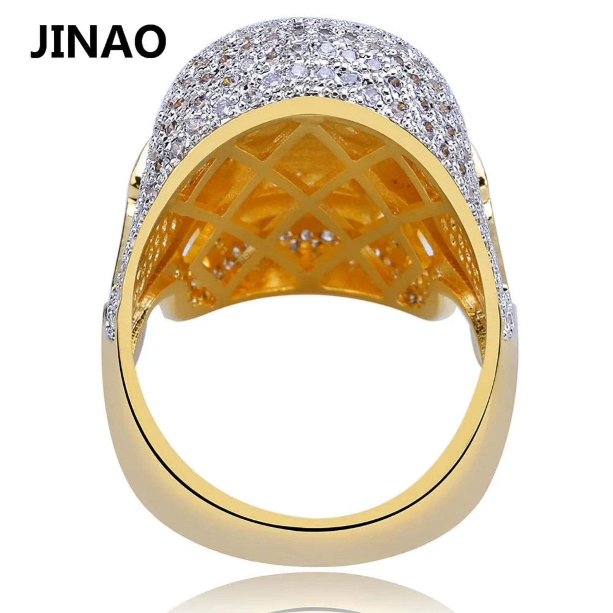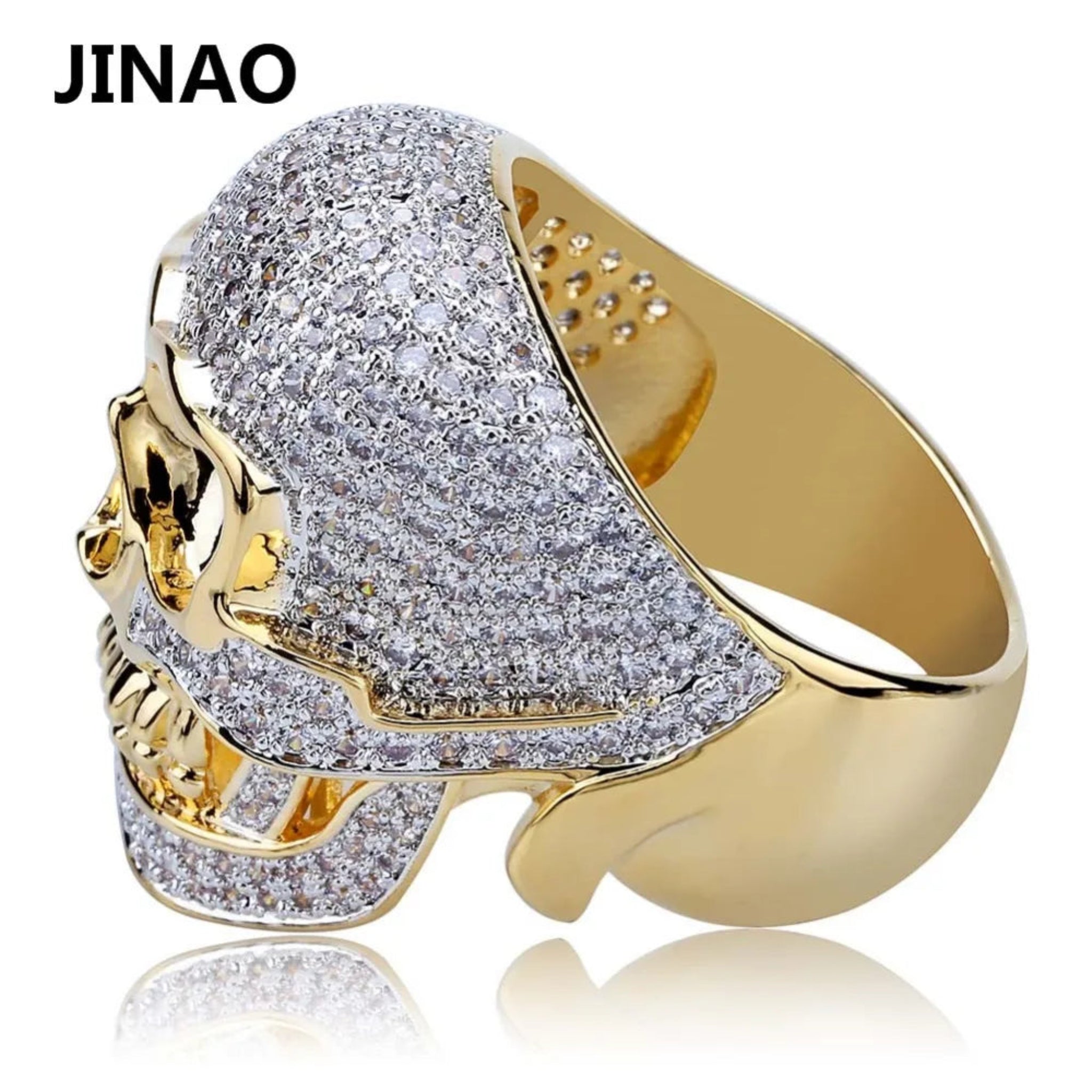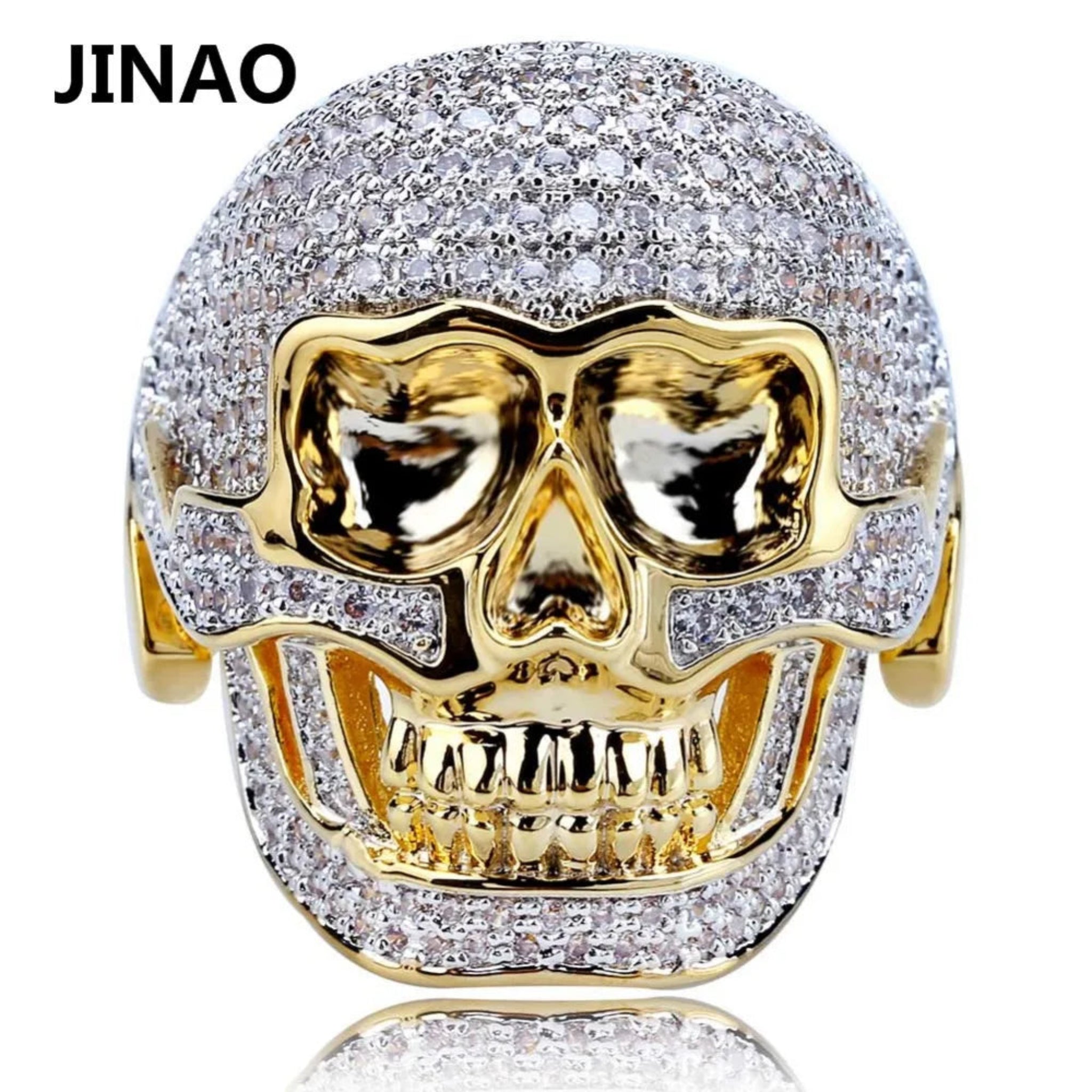 JINAO Hip Hop Copper Two Tone Skull Ring Iced Out Micro Paved Cubic Zircon Punk Fahion Ring for Men Women with 7,8,9,10,11 Size