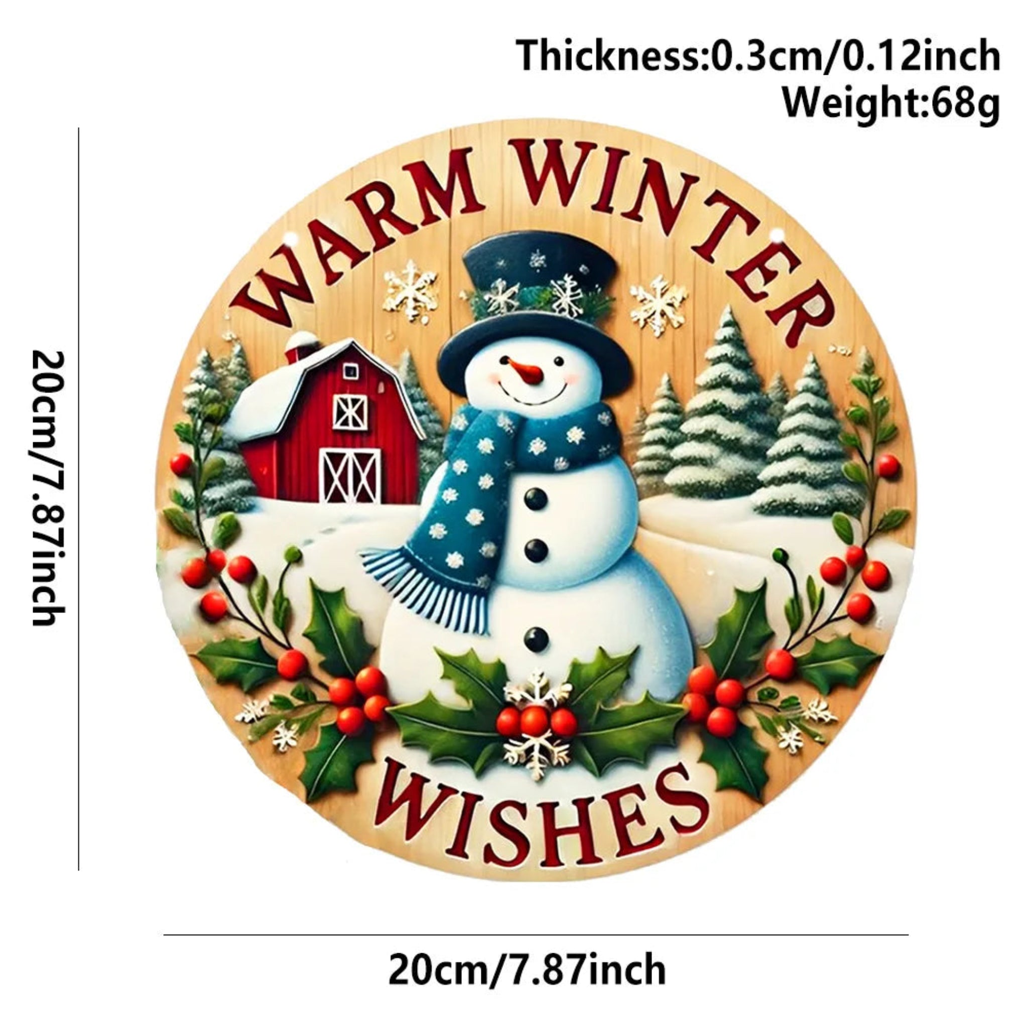 Size: 7.9 inches; Material: Acrylic; Design: Round shape with snowman; Type: Holiday wall/door hanging ornament.