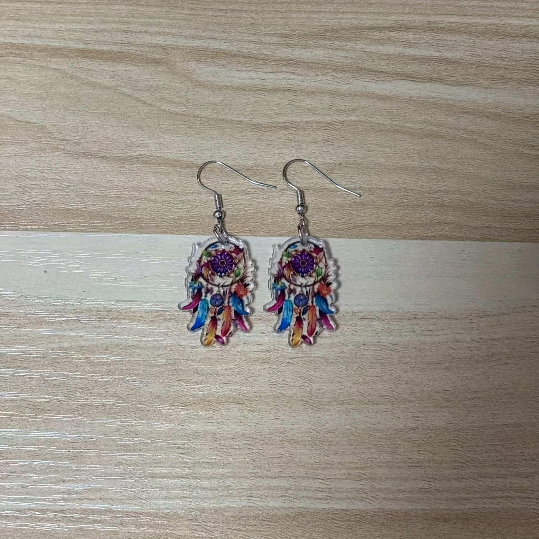 Vibrant Feather Earrings] Vibrant 2D Bohemian Feather Acrylic Pendant Earrings